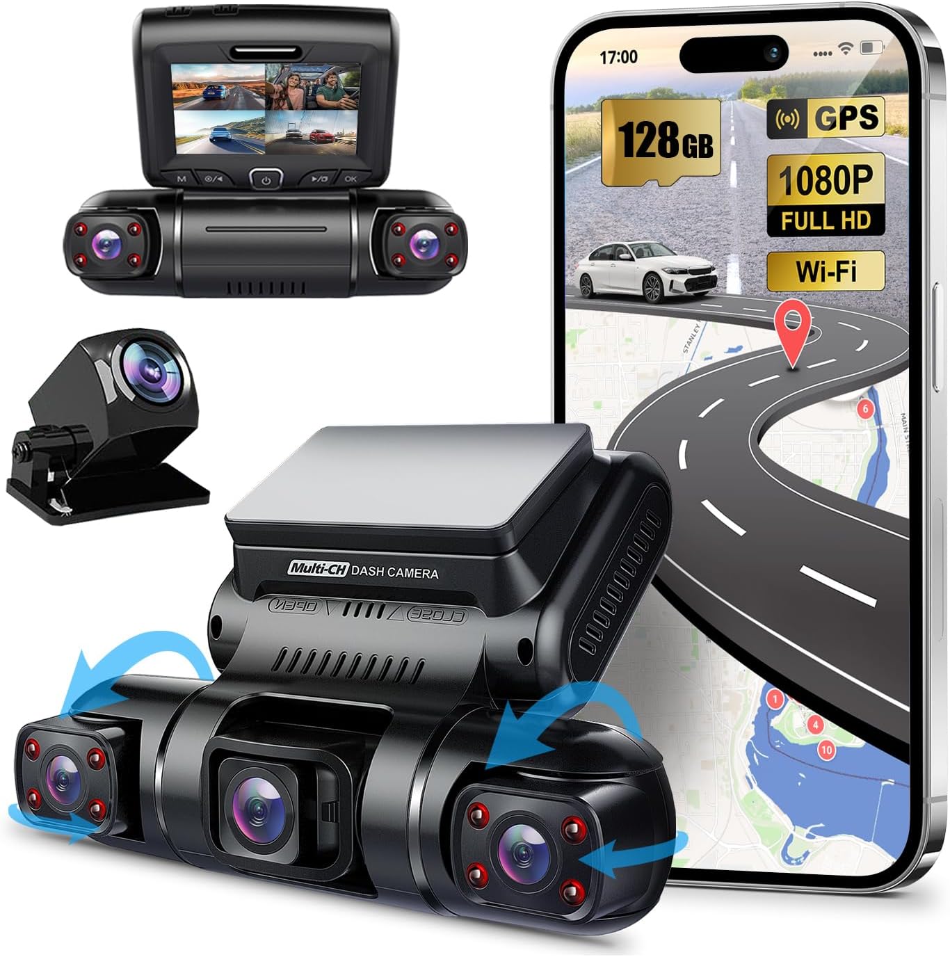 - [4 Channel Front and Rear and Inside Dash Cam] The quad FHD 1920*1080P dash cam's 150-degree super wide-angle lens and 3 inches huge LCD screen gives sharper movies and images even when traveling at high speeds, and allow you to re-watch important moments. The first dash cam can simultaneously record the front and sides of the vehicle and the two cabin cameras can freely change the recording angles and rotate left and right allowing you to record in opposite directions as well.