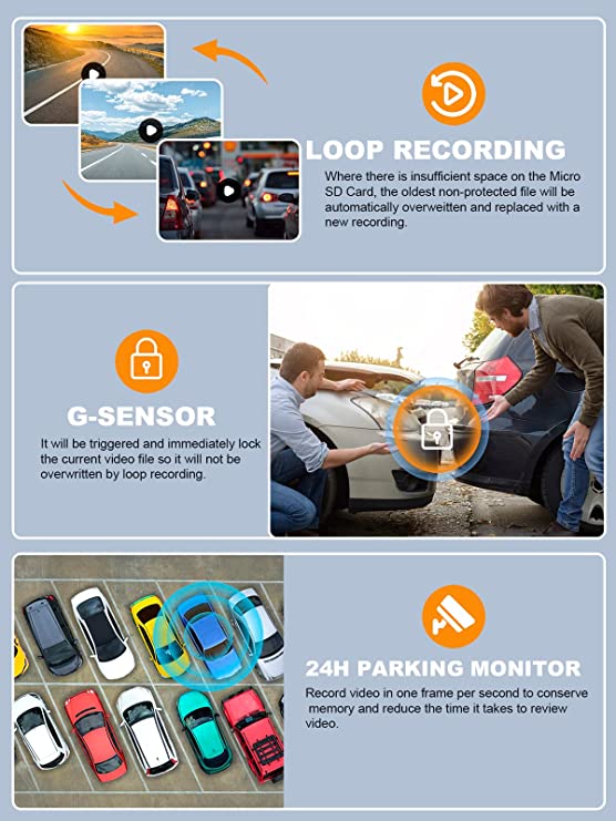 - [Loop Recording & Crash Lock] To ensure endless loop recording, the dash cam automatically deletes the oldest unlocked footage when the memory card reaches its maximum capacity. In the event of a collision, the dash cam will automatically lock the currently recorded footage as evidence. Locked files are not overwritten by loop recording.